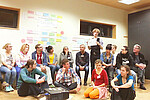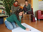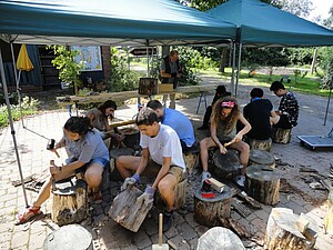 Neben friedenspädagogischen Einheiten, Aktionen zum Team-Building und einem Besuch der Gedenkstätte Bergen-Belsen ging es in zwei Gruppen auch ganz praktisch zu. Während die eine Gruppe Sitzbänke aus Holz zusammenzimmerte, griff die andere zu Farbe und Pinsel und gestaltete gemeinsam zwei große Bilder zur Verschönerung des Seminarraums. […] Florian Krauß vom Antikriegshaus hatte dafür lediglich eine Grundidee geliefert. „Alles andere haben die Teilnehmer selbständig im Team erarbeitet“, betonte er.